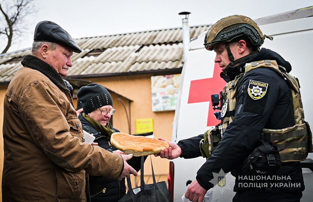 Крім того, у Юрківці та Таврійському правоохоронці разом із громадською організацією передали хліб місцевим жителям, які вирішили ще залишатися у рідних оселях.